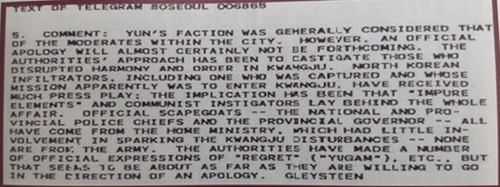 특히 정부는 “정씨가 봉기의 주동자이자 김대중과 밀접하게 활동하며 ‘폭력을 통해 정부를 전복하려 했다(overthrow the government by violence)’”고 주장한다고 미 대사관은 보고문을 띄웠다.