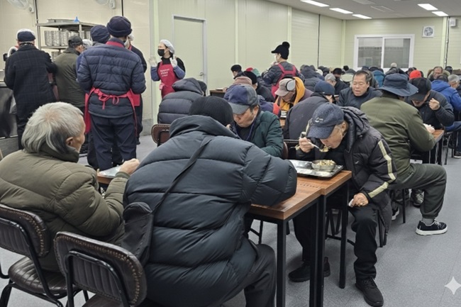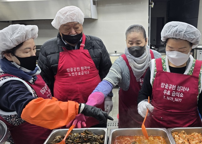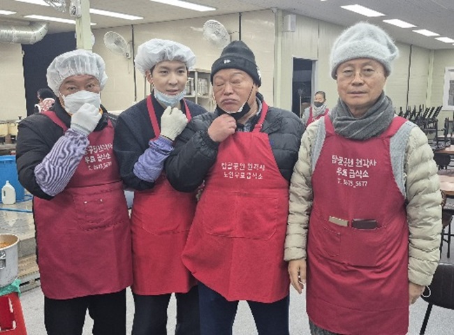 연말을 맞아 한미일보 회장 정성홍과 고문 성호스님이 애국 우파 가수 김흥국, 뮤지컬 배우 차강석 등과 함께 23일 서울 종로구 탑골공원원각사무료급식소에서 1시간가량 봉사활동에 참여했다. 맨 위 사진 왼쪽부터 △정성홍 한미일보 회장 △자광명 보살 △가수 김흥국 △뮤지컬배우 차강석 △한미일보 고문 성호스님 △KBS 탤런트 양재원.