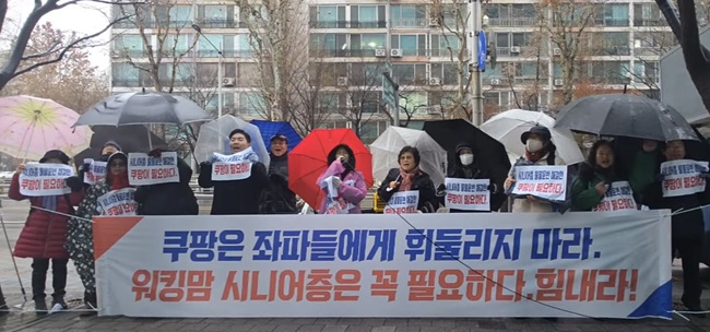 이에 대한민국 엄마부대(대표 주옥순)가 23일 서울 송파구 쿠팡 본사 앞에서 민주노총에 항의하는 시위를 열고 공식 성명서를 발표했다.