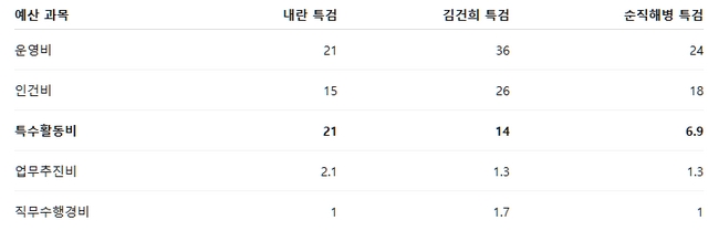 특검별로는 내란 특검이 21억원으로 가장 많았고, 김건희 특검이 14억원, 해병 특검이 6억9000만원을 각각 집행했다. (집계 기준에 따라 반올림·항목 포함 여부로 총액에는 차이가 발생할 수 있다.)