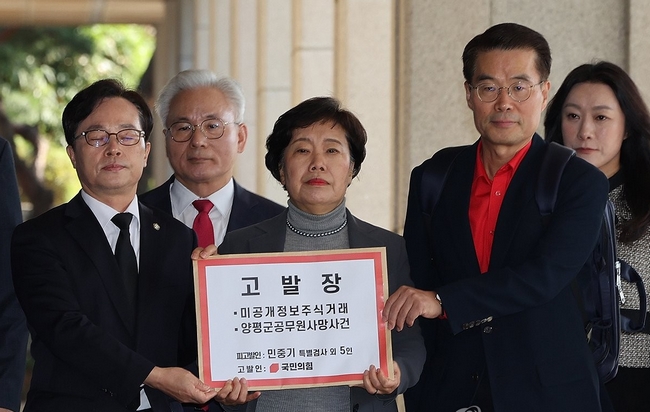 국민의힘 조배숙 사법정의수호 및 독재저지 특별위원회 위원장과 숨진 채 발견된 경기 양평군청 소속 공무원의 변호를 담당한 박경호 변호사가 22일 서울 서초구 서울중앙지검에서 민중기 내란 사건 특별검사에 대해 자본시장법위반, 직권남용 등의 혐의로 고발을 위해 이동하고 있다. 2025.10.22 [사진=연합뉴스]