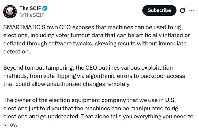 정치 이슈를 주로 다루는 ‘The SCIF’ 계정이 소셜미디어 X에서 스마트매틱의 CEO가 직접 “선거 조작에 기계를 이용할 수 있다”고 인정한 영상을 공개했다.