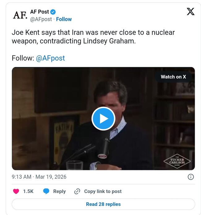 미치 맥코넬(Mitch McConnell,공화·켄터키) 상원의원은 17일(화) 엑스에 "조 켄트는 1년 전 상원 청문회에서 이란과 그 테러 대리 세력이 중동에서 미군을 위협하고 있다고 증언했다"면서 "그는 테러와의 전쟁에 복귀하는 것을 영광으로 생각하며, 청렴하고 책임감 있는 자세로 임무를 수행하겠다고 다짐했다"고 지적했다.