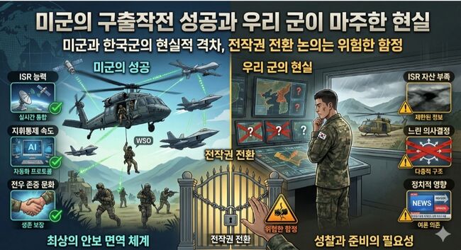 미군의 적지에 고립된 군인 구출작전의 성공은 우리에게 냉정한 사실을 상기시킨다. 독립적 지휘권은 선언으로 완성되는 것이 아니라, 결단력·정보력·지휘력·전력·문화라는 ‘안보 면역 체계’가 갖춰질 때 비로소 현실이 된다. 지금 필요한 것은 조급한 전작권 전환이 아니라, 미군의 4차원 전투체계를 배우고 내실을 다지는 성찰과 준비다. 대한민국이 생존하기 위한 안보 담론은 여야가 따로 있을 수 없다.