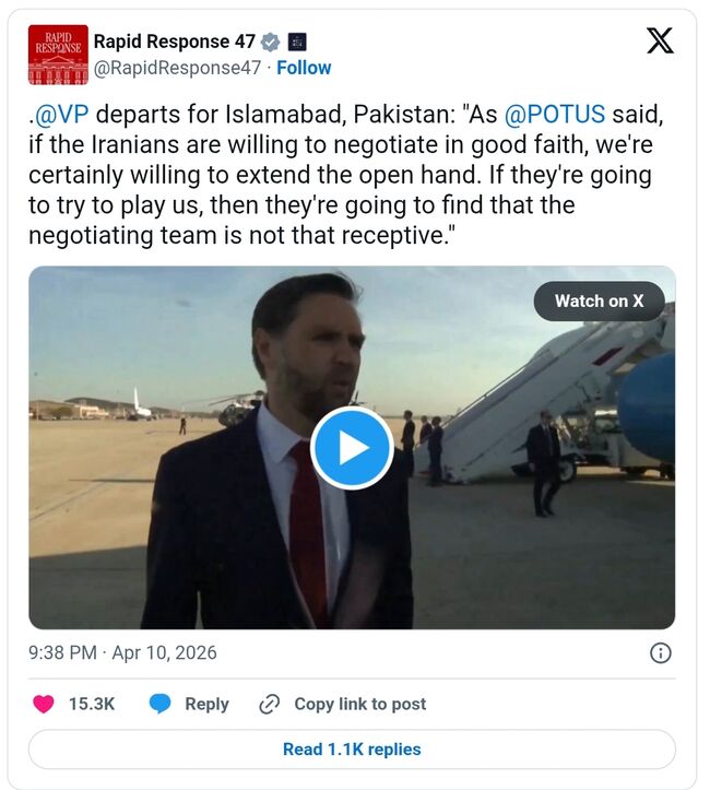 JD 밴스 부통령은 10일(금) 이란과의 전쟁 종식을 위한 협상에 참석하기 위해 파키스탄으로 출국했다. 그는 이슬라마바드에서 열리는 이번 협상에서 강력한 합의가 이뤄질 것이라는 낙관적인 전망을 내놨다.