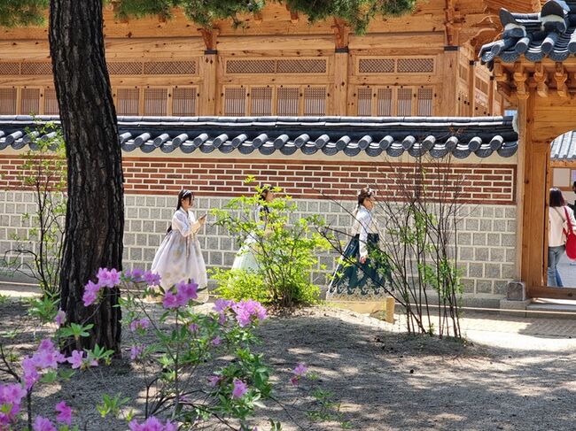 한복을 입고 궁궐 뜰을 거니는 관람객들. [사진=임요희 기자]
