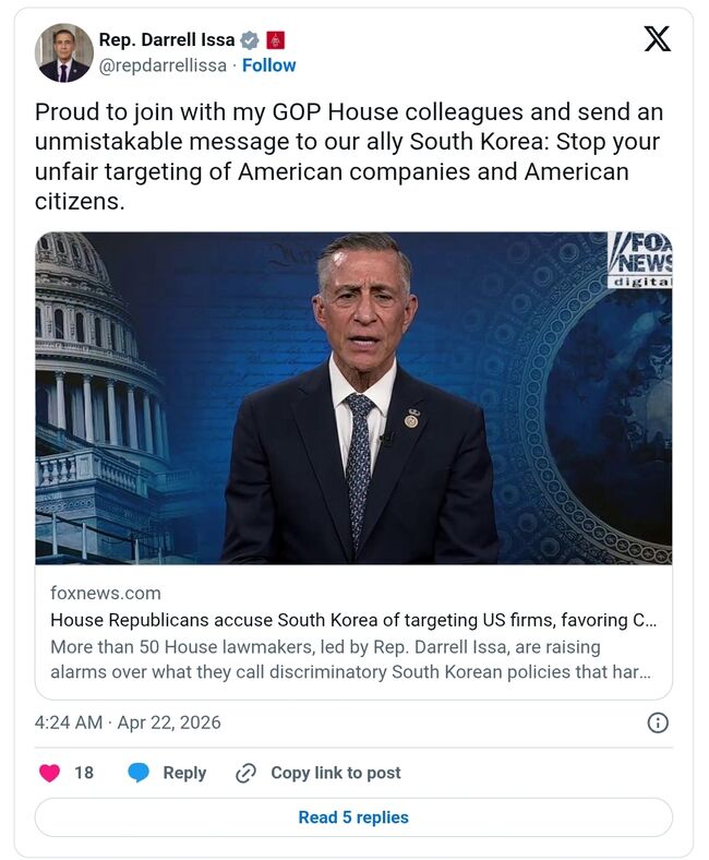 대럴 아이사(Darrel Issa,공화·캘리포니아) 하원의원은 21일(화) 엑스(X)에 "공화당 하원 동료들과 함께 합류하게 돼 자랑스럽다. 우리 동맹국 대한민국에 명백한 메시지를 보낸다"라며 "미국 기업과 미국 시민에 대한 불공정한 표적화를 멈춰라"라고 촉구했다.
