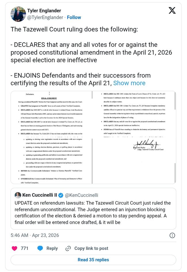 버지니아주 법무장관 제이 존스(민주)는 엑스에 "즉시 항소할 것"이라며 "활동가 판사가 주민투표에 대한 거부권을 행사해서는 안 된다"고 밝혔다.