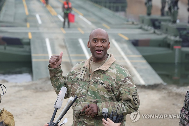 임진강 찾은 브런슨 한미연합사령관14일 경기도 연천군 임진강에서 실시된 한미연합 도하훈련에서 제이비어 브런슨 한미연합사령관이 취재진과 인터뷰하고 있다. 한미연합훈련 '자유의 방패'(프리덤실드·FS) 연습 일환으로 실시된 이번 훈련에는 미2사단/한미연합사단과 한국군 수도기계화보병사단 및 7공병여단이 참가했다. [연합뉴스]