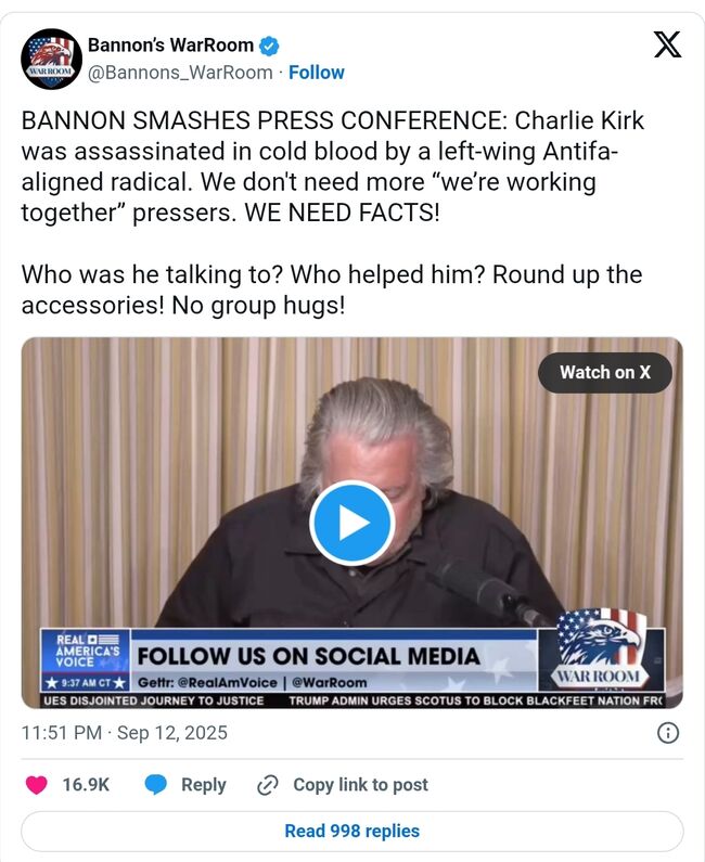 스티브 배넌 역시 자신의 팟캐스트에서 이날 기자회견 발표가 부족하다고 질타하면서, 용의자가 최소한 안티파(Antifa)와 연계돼 있다는 점과 더 자세한 사건 배경에 대해 밝혀야 한다고 주장했다.