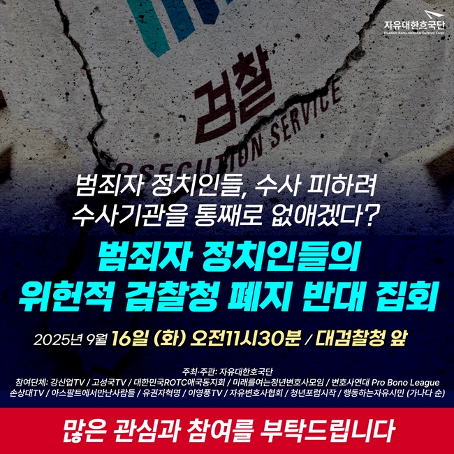 자유애국시민단체들이 이재명 정권의 위헌적 검찰청 폐지를 반대하는 집회를 16일 오전 11시30분 대검찰청 앞에서 가진다.