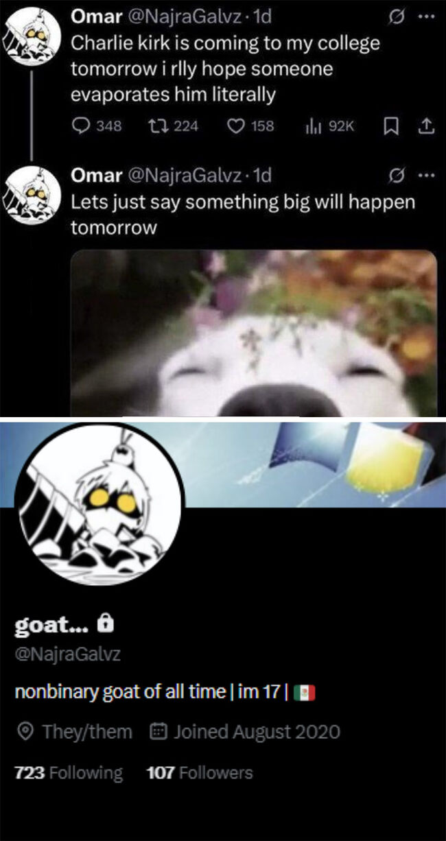 커크에게 죽음을 기원하며 그가 유타 밸리 대학에 오면 “큰 일이 벌어질 것”이라고 예언한 엑스 계정 @NajraGalvz는 자신을 비이성애자(nonbinary)로 밝혔다.