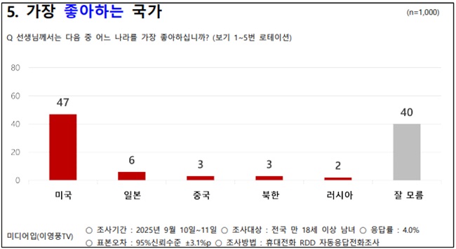 가장 좋아하는 국가로는 미국(47%)이 가장 높게 나왔다. 이어 일본(6%)·중국(3%)·북한(3%)으로 집계됐다.