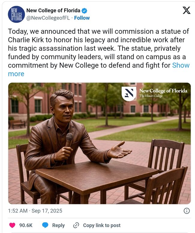 플로리다 뉴 칼리지는 16일(화) 찰리 커크의 동상을 건립할 것이라고 발표했다. 2025. 9.16. [엑스 발췌]
