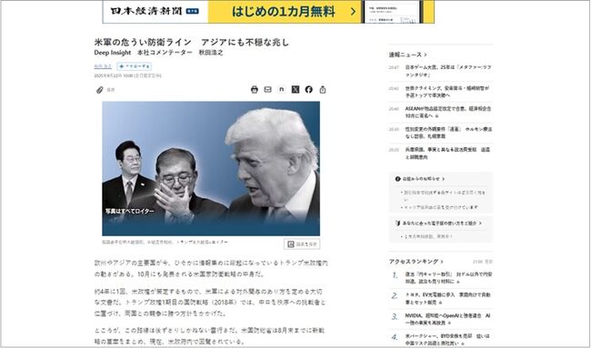 다만, 기사를 작성한 아키타 히로유키(秋田 浩之) 기자는 ‘언행’의 근거로, 트럼프 대통령이 대중 무역 적자와 관련해서는 중국에 화가 잔뜩 났지만 미군이 아시아 안보 수호에 깊이 관여함으로써 중국군 확장에 제동을 걸겠다는 의지가 부족하다는 점을 근거로 꼽았다.