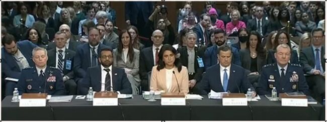 털시 개버드(가운데) 미국 국가정보국(DNI) 국장과 캐시 파텔(왼쪽 두번째) 연방수사국(FBI) 국장·존 랫클리프(오른쪽 두번째) 중앙정보국(CIA) 국장이 지난 3월26일(현지시간) 미국 워싱턴 D.C. 연방 의사당에서 열린 상·하원 정보위원회 청문회에 참석해 있다. / FOX방송 캡처.