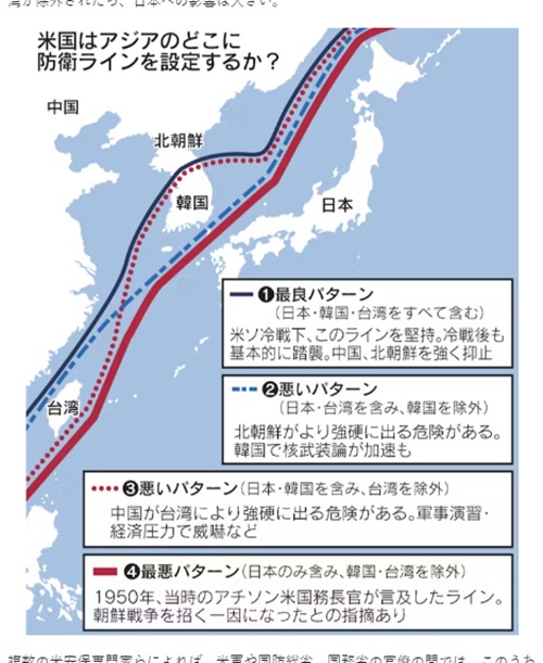 그러나 미국이 한국만을, 또는 대만과 더불어 한국을 방어라인에서 제외하는 결정을 내릴 경우, ‘과거의 지극히 무거운 교훈(過去に極めて重い教訓)’을 떠올려야 한다고 언급했다.