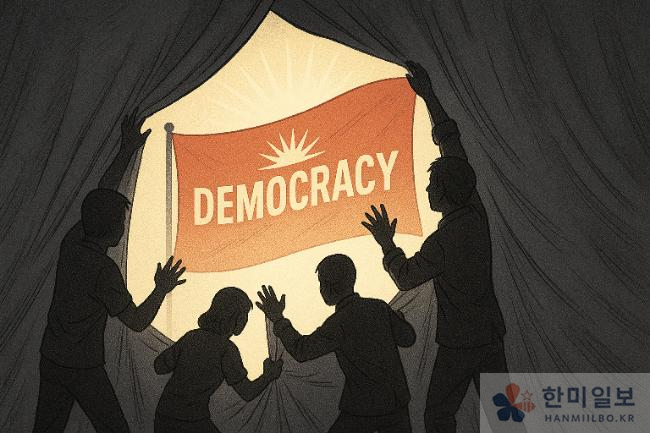 장막을 걷어낸 자리에서 드러나는 민주주의의 빛. 신뢰는 감추는 것이 아니라 드러내는 데서 시작된다. 한미일보 그래픽
