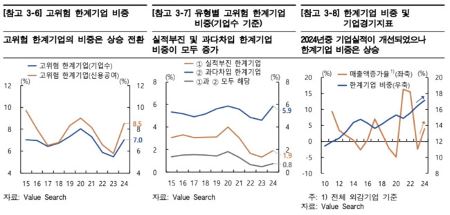 실적 부진, 과다 차입 등으로 부실 가능성이 큰 고위험 한계기업 비중 역시 2023년 5.5%에서 지난해 7.0%로 상승했다.