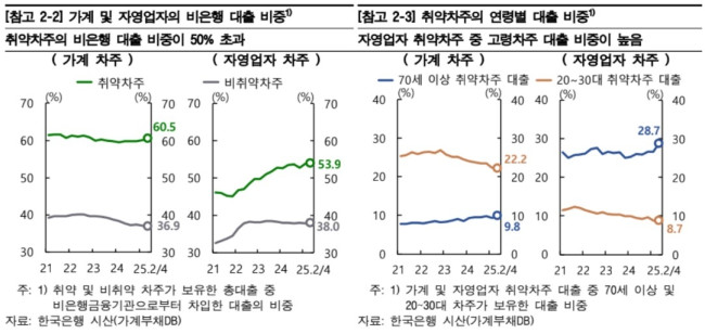 이는 가계 취약차주 중 고령 차주 비중이 9.8%로, 20∼30대(22.2%)의 절반 미만인 것과 대조됐다.