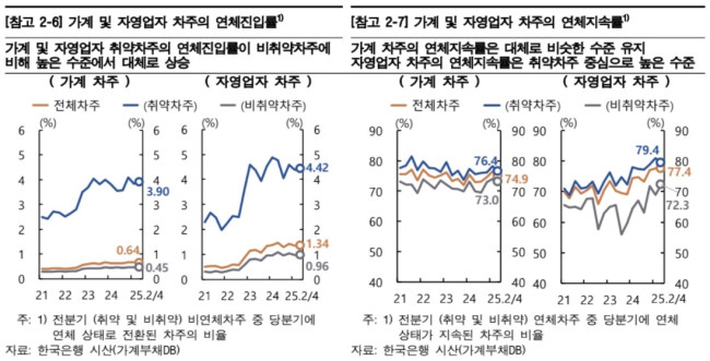 2021년 약 2.5% 수준이었던 가계와 자영업자 취약차주의 연체 진입률은 올해 2분기 말 각각 3.90%, 4.42%로 높아졌다.