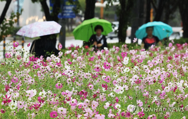 경기 수원시 영통구 경기도청 앞에서 우산을 쓴 시민들이 활짝 핀 코스모스 사이를 지나고 있다. [연합뉴스 자료사진]