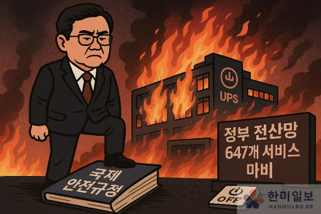 국제 안전규정을 밟고 선 채 불타는 국정자원을 바라보는 책임자. 전력 이중화 부재로 647개 정부 전산망이 마비된 사태가 인재임을 설명한다. 한미일보 그래픽