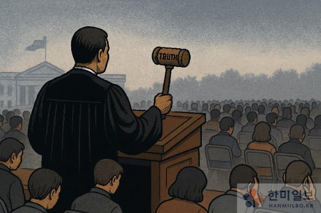 의사봉 쥔 연설가, 뒤돌아앉은 군중. 장외는 법정이 아니다. 한미일보 그래픽