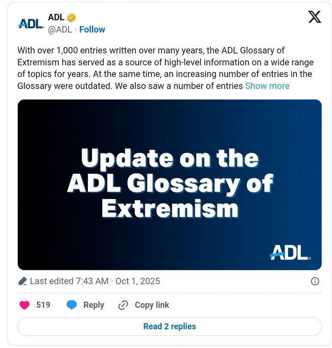ADL은 엑스에 해당 용어집에 대해 "수년간 1,000개가 넘는 항목이 작성된 ADL 극단주의 용어집은 수년간 다양한 주제에 대한 고급 정보의 원천 역할을 해왔다. 하지만 동시에 용어집에 있는 항목 중 점점 더 오래된 항목이 늘어났다. 또한 의도적으로 잘못 해석되고 오용되는 항목도 많았다."라고 밝혔다.