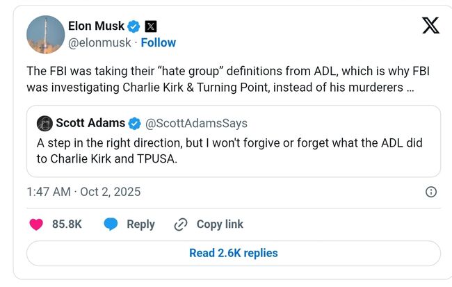 일론 머스크는 엑스에 올린 글에서 "FBI는 ADL에서 '혐오 단체'라는 정의를 따랐다. 그래서 FBI는 찰리 커크와 터닝 포인트를 그의 살인자 대신 수사하고 있었던 것"이라고 썼다. 머스크는 별도의 글에서 ADL을 "혐오 단체"라고 불렀다.