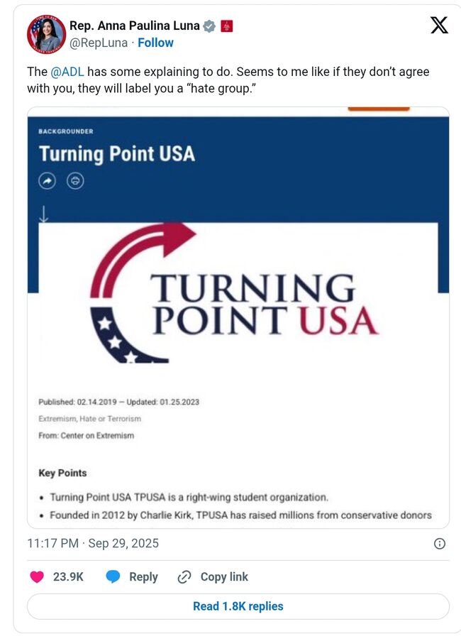 ADL은 최근 일론 머스크를 비롯한 여러 공화당원들로부터 "극단주의와 증오 용어집"에 터닝 포인트 USA를 포함시켰다는 이유로 비판을 받았다. ADL은 반발이 커지자 화요일 해당 용어집 전체를 삭제했다.
