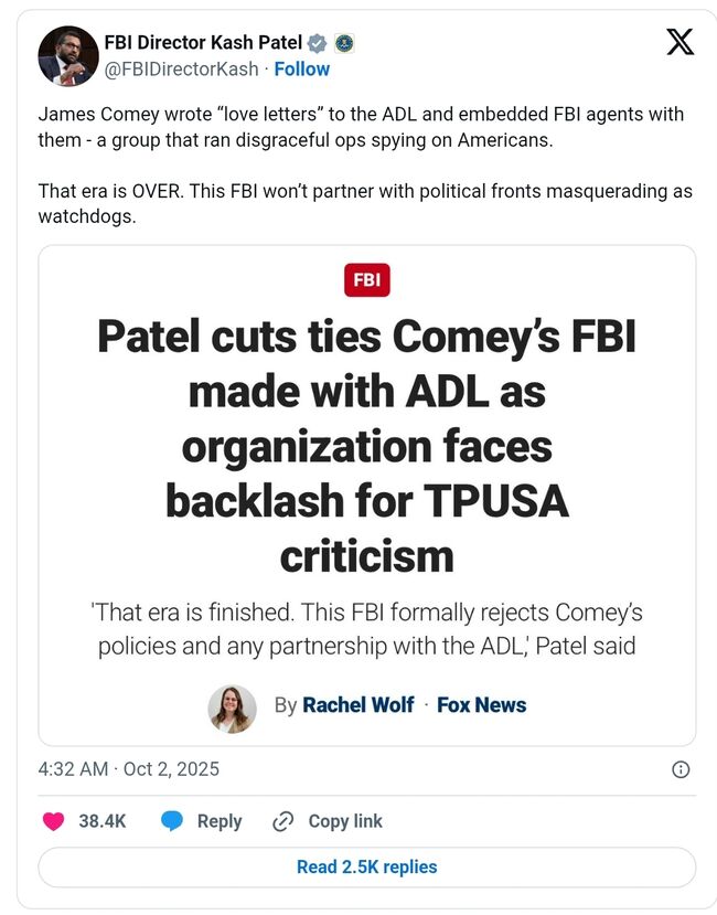 파텔은 엑스(X)에 "제임스 코미는 ADL에 '연애 편지'를 쓰고 FBI 요원들을 그 안에 포함시켰다. ADL은 미국인을 감시하는 부끄러운 작전을 수행했던 조직이다."라면서 "그런 시대는 끝났다. 이 FBI는 감시기관으로 위장한 정치 세력과 손을 잡지 않을 것이다."라고 선언했다.