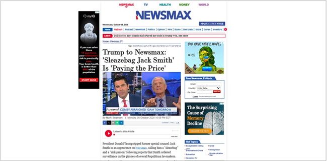 6일(현지시간) 미국 보수매체 뉴스맥스 방송에 출연한 도널드 트럼프 대통령이 공화당 의원들의 통신 기록을 불법으로 조회하게 지시한 의혹이 최근 폭로된 잭 스미스 특별검사에 대해 “끔찍하고 경멸스러운 녀석”이라고 맹공을 퍼부었다. / 뉴스맥스 온라인 캡처.