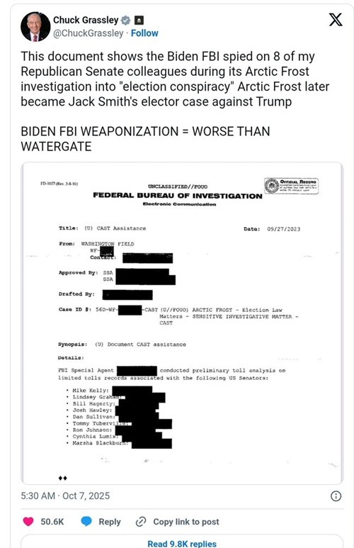 한편 공화당 척 그래슬리(Chuck Grassley·아이오와) 연방 상원의원은 이날 엑스(X·옛 트위터)에 조 바이든 행정부 시절 연방수사국(FBI)이 2021년 1월6일 의회 사건과 관련해 공화당 상원의원 9명에 대해 통신 기록을 조회했다는 기밀 문건을 전격 폭로했다.