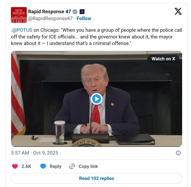 트럼프 대통령은 시카고에서 발생한 사태와 관련해 "경찰이 ICE 요원들의 안전을 위해 출동하는 것을 취소하는 집단이 있다면... 그리고 그걸 주지사도 알고 있었고 시장도 알고 있었다면 - 내가 알기로는 이는 형사 범죄에 해당한다"고 말했다.