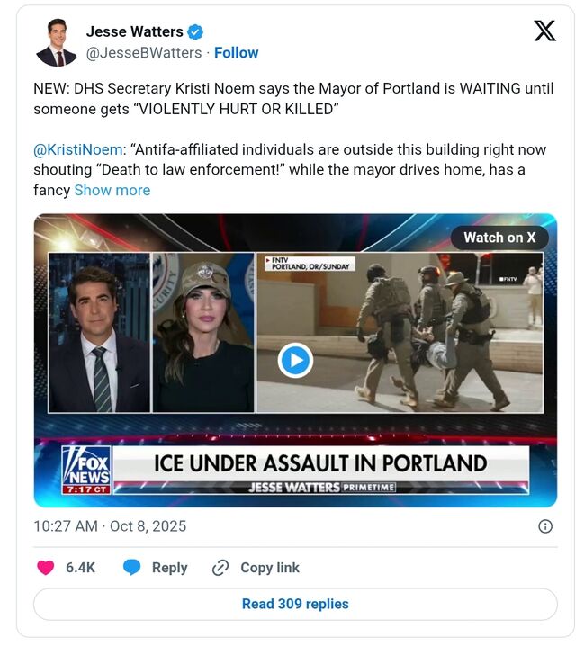 크리스티 노엠 장관은 7일(화) 폭스뉴스의 제시 워터스와 가진 인터뷰에서 포틀랜드 시장이 누군가 “심하게 다치거나 죽을 때까지 기다리고 있다”면서 "안티파 관련자들이 지금 이 건물 밖에서 ‘경찰은 죽어라!’라고 외치고 있는데, 시장님은 집에 차를 몰고 가서 고급 저녁을 먹고 편안한 침대에서 잠을 자고 있다"고 말했다.