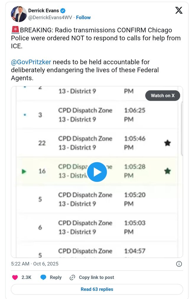 지난 주말 시카고에서는 ICE 요원들이 911로 전화를 걸어 시위대가 자신들을 둘러싸고 위협하고 있으니 지원해 달라고 요청했으나 경찰은 ICE 요청에 응하지 말라는 명령을 받은 것으로 알려져 충격을 주고 있다. SNS에는 경찰이 출동하지 말라는 명령을 받았다는 통신 녹음이 공개돼 논란이 커지고 있다.