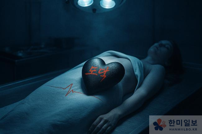 냉광 아래 멈춘 심장, 잉크처럼 번진 도덕의 흔적. 한국 좌파의 부검대에 남은 것은 '도닥'이라는 오독뿐이었다. 한미일보 그래픽