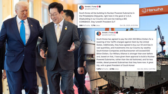 트럼프 대통령은 또다른 트루스 게시물을 통해 "한국은 원자력 잠수함을 바로 여기 미국 필라델피아 조선소에서 건조할 것"이라며 "우리나라 조선업은 곧 '대대적인 부활'(BIG COMEBACK)을 맞이할 것"이라고 강조했다.