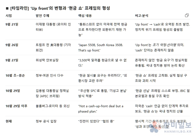 본 기사는 9월 중순부터 10월 말까지 한미 협상 관련 외신과 정부 발언 로그를 메타데이터로 추적한 탐사형 분석보도입니다. ‘Up front’의 의미, ‘현금 쇼’ 프레임의 형성과 붕괴, 그리고 펀드 통제 구조 속에 숨은 주권의 이동을 집중 해부합니다. <편집자 주>