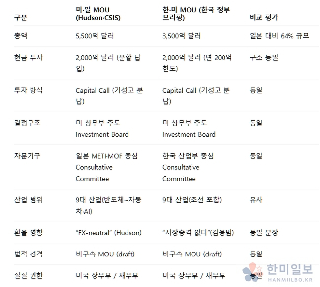 일본은 5,500억 달러 중 1,000억 달러를 3년 반 내에 집행하고 이후 단계별 연장을 두는 집중형 모델이었다. 반면 한국은 총액 2,000억 달러, 연간 200억 달러 한도라는 장기 분납형 구조다. 최소 10년이 필요한 개방형 시스템이다.