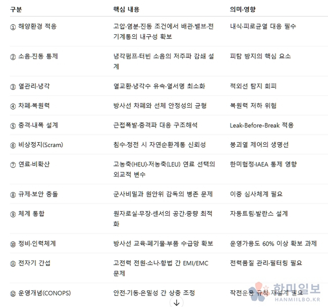 핵잠은 한 척이 아니라 정비 생태계다. SMR을 단 한 척 장착해도 교육·부품·폐기 체계가 없다면, 그건 떠 있는 원자로일 뿐이다. 핵잠의 진짜 무기는 연료도 소음도 아닌 ‘사람’이다. 사람이 기술을 믿을 때, 그 배는 돌아온다.