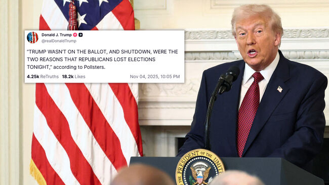 그는 트루스소셜에 "여론조사 기관들에 따르면 '트럼프가 투표용지상에 없었다, 그리고 셧다운, 이 두 가지 원인이 공화당이 오늘밤 선거에서 진 이유다'"라고 썼다.