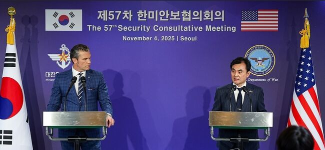 4일 서울 용산 국방부 청사에서 열린 제57차 한미안보협의회의(SCM) 공동기자회견. 연합뉴스.