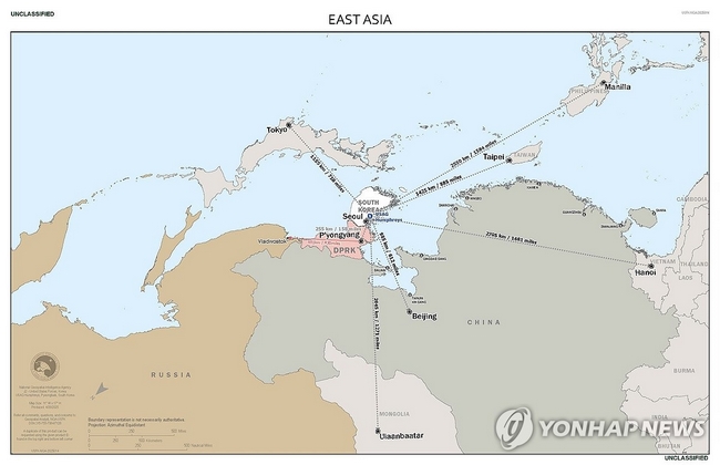 제이비어 브런슨 주한미군사령관 겸 한미연합군사령관은 동아시아 지도를 뒤집어보면 한국, 일본, 필리핀 3국의 전략적 협력 필요성을 느낄 수 있다고 17일 밝혔다. 사진은 뒤집힌 한반도 지도. [주한 미군 제공. 재판매 및 DB 금지] 연합뉴스