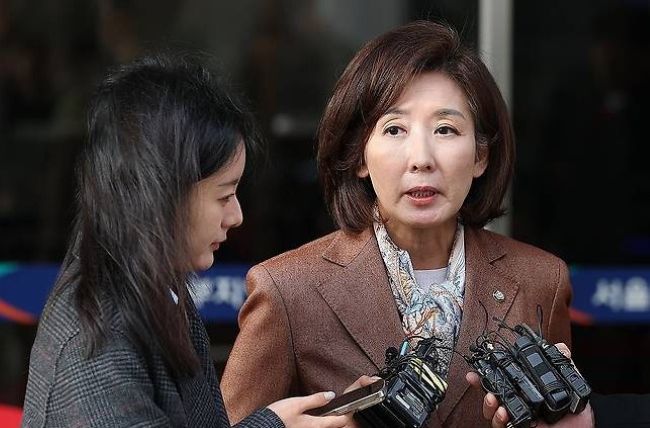 20일 오후 나경원 국민의힘 의원이 법원을 나서며 기자들의 질문에 답하고 있다. 나 의원 등은 ‘2019년 국회 패스트트랙 충돌’ 사건이 있은 지 6년7개월 만에 1심을 선고받았다. 연합뉴스