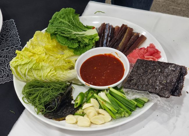 이날 가장 인기 있었던 메뉴는 뭐니뭐니해도 미역과 김에 싸 먹는 전통적인 과메기회였다. 접시가 가장 빨리 동이 나는 바람에 두 명인은 자주 세팅을 해야 했다.