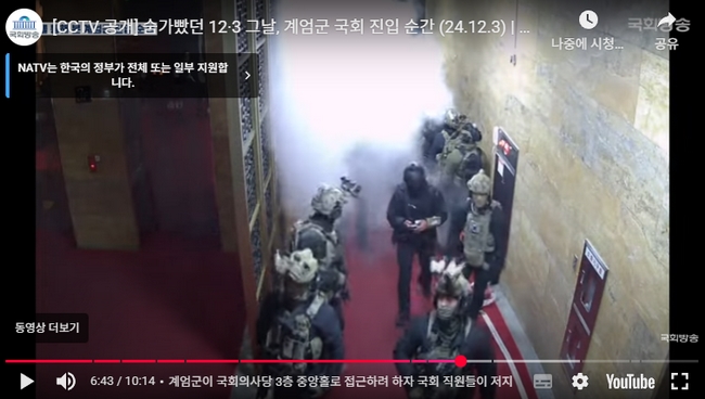 계엄 당일 국회 본관 앞으로 다가가는 계엄군. 착탄도 착검도 없는 상태로 국회 정문으로 걸어서 접근 중이다. 12.12 비상계엄 당시와 확연하게 비교가 된다. 이 영상은 당시 실시간으로 생중계가 됐었다. [국회방송 영상 캡처]