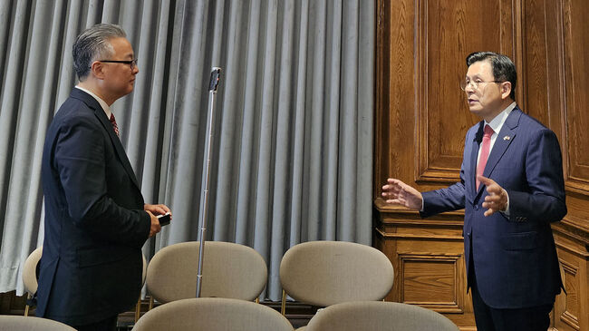 황교안(오른쪽) 자유와혁신당 대표가 25일(현지시간) 홍성구 뉴스앤포스트(NNP) 대표기자와 인터뷰하고 있다. / 사진=NNP-한미일보 공동 취재.