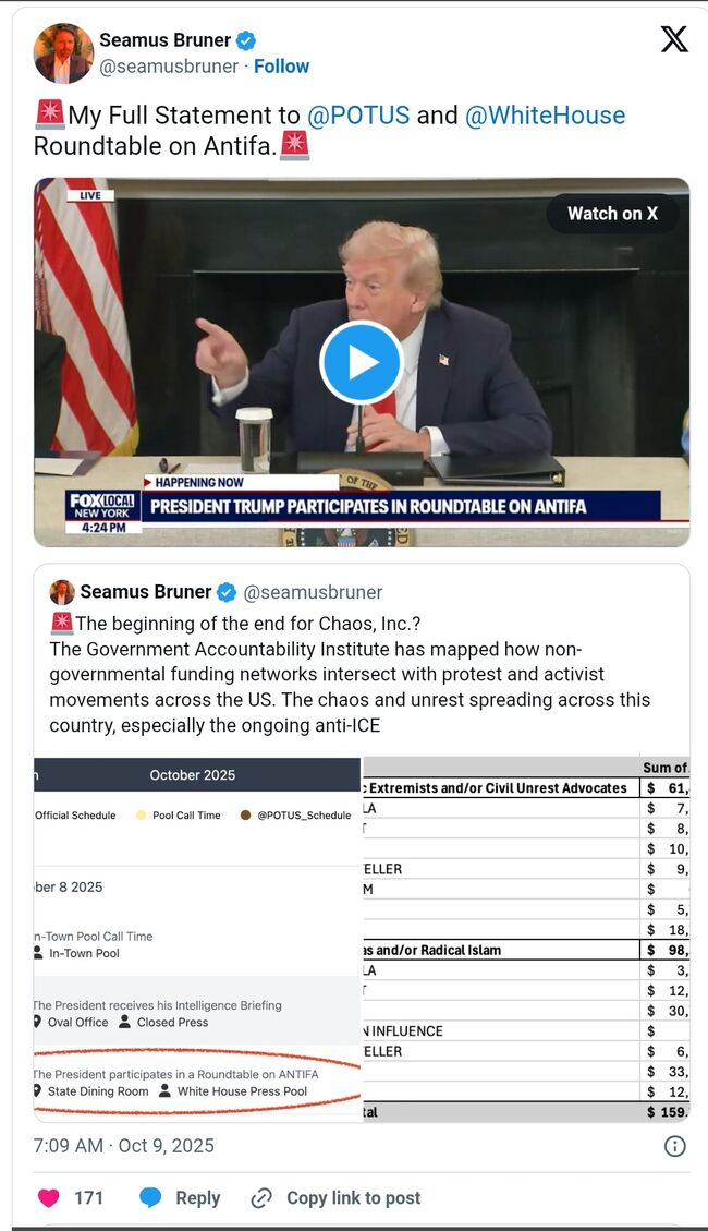 8일(수) 오후 도널드 트럼프 대통령과의 안티파 관련 원탁 회의에서 브루너는 자신과 GAI 대표 피터 슈와이처(Peter Schweizer), 그리고 그들의 팀이 자금 흐름을 추적해 이른바 ‘시위 복합산업’(Protest Industrial Complex) 또는 ‘폭동 주식회사’(Riot Inc.)의 정점에 도달했다고 설명했다.